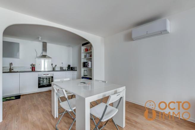 Grande colocation meublée refaite à neuf en 2023, chauffage/clim pompe à chaleur, pièce à vivre 30m² avec cuisine équipée (plaque induction, four et micro-ondes, lave-vaisselle), salle à manger, salon avec TV. L'immeuble dispose d'une buanderie avec lave et sèche-linge.